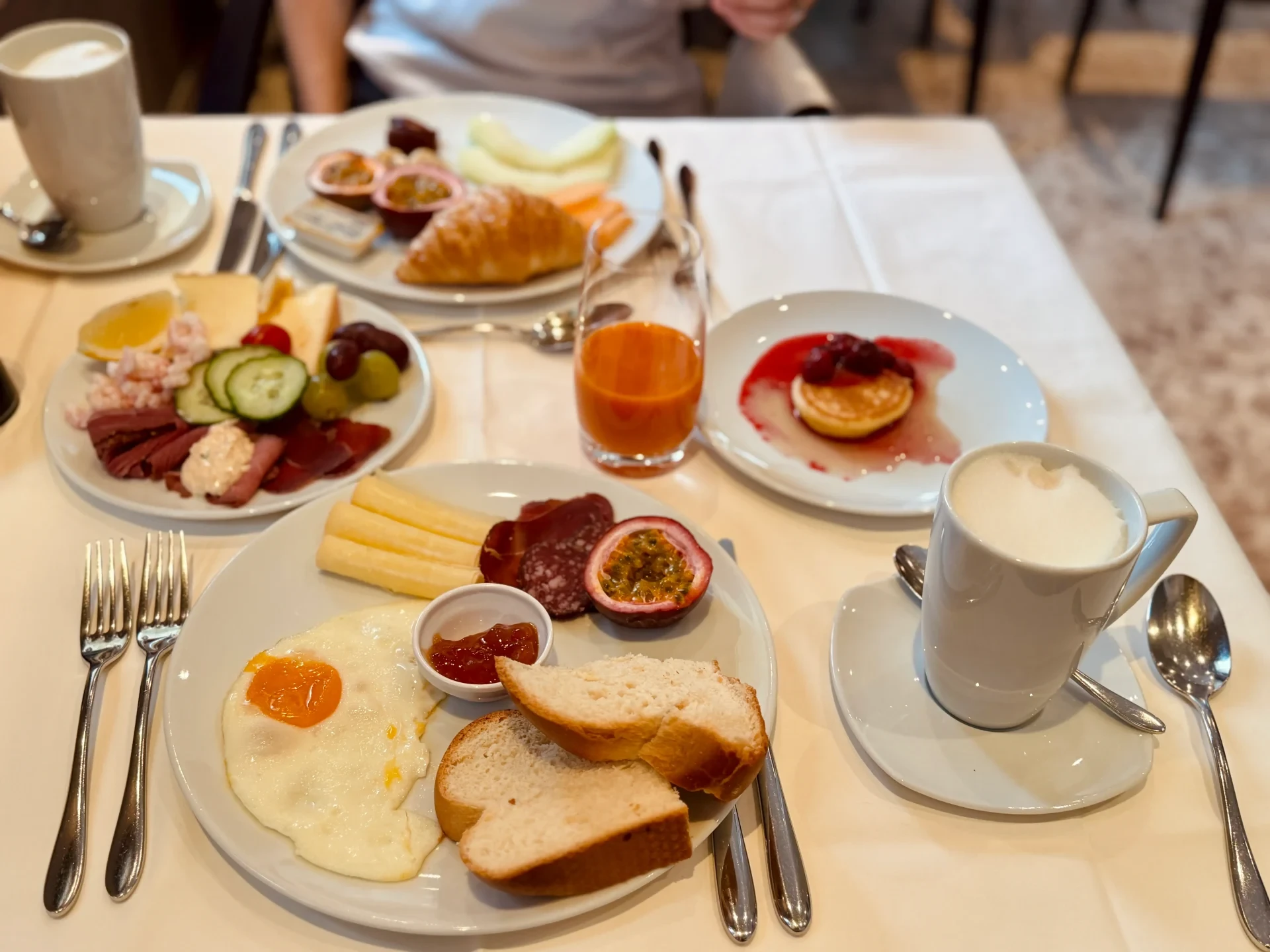 Wir haben das grosse Frühstück getestet, das mit knusprigem Baguette, Käse, Honig, Konfitüre, Müsli, Früchten und Gemüse aufwartet. Und wenn Pancakes auf der Speisekarte stehen, können wir selten widerstehen. Es hat sich absolut gelohnt: Die Pancakes mit Beeren und Quark waren sehr yummy!