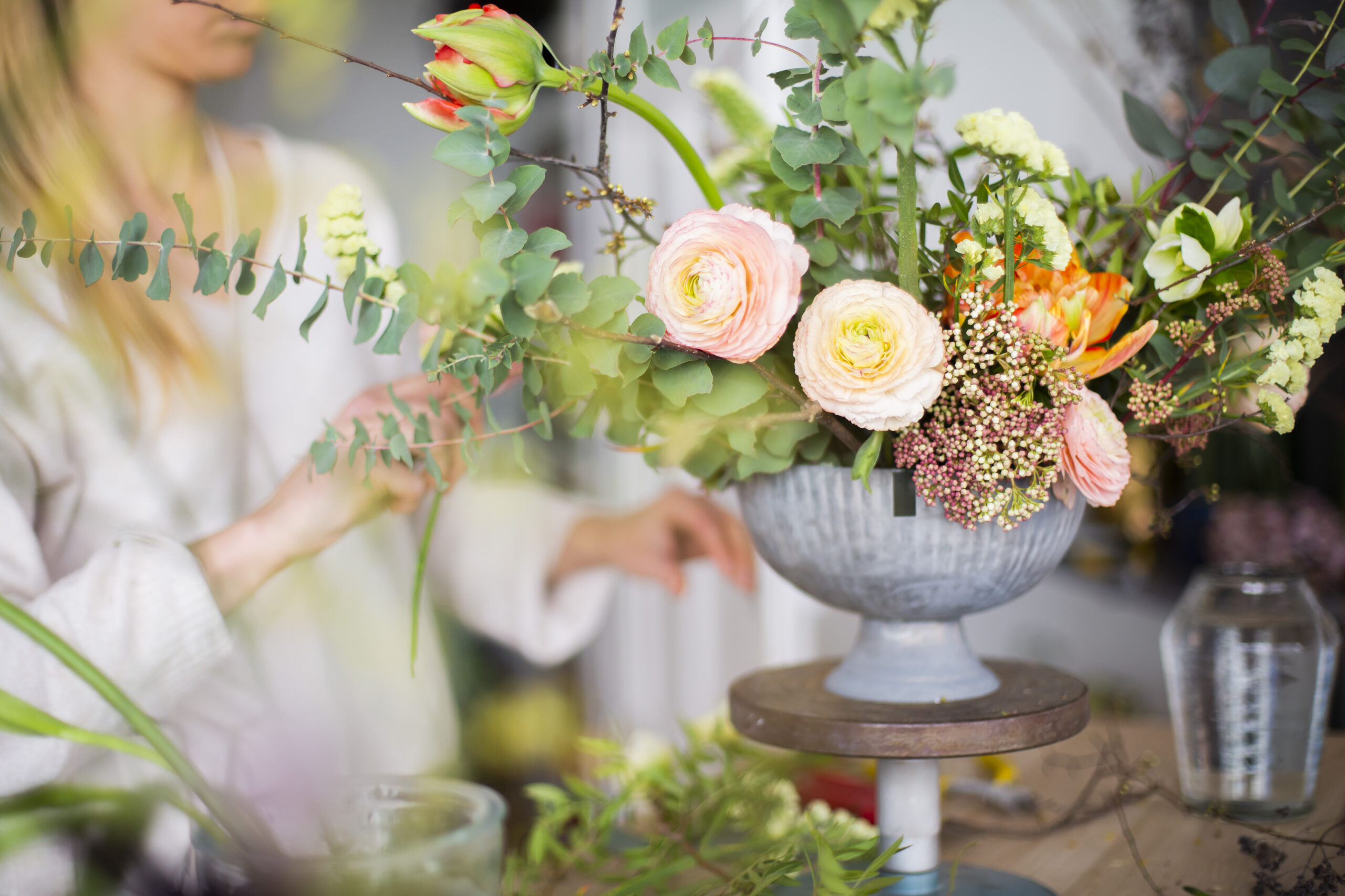 - Du besorgst dir Blumen und Grünzeugs wie zum Beispiel Schleierkraut, Eukalyptus- oder Olivenzweige.